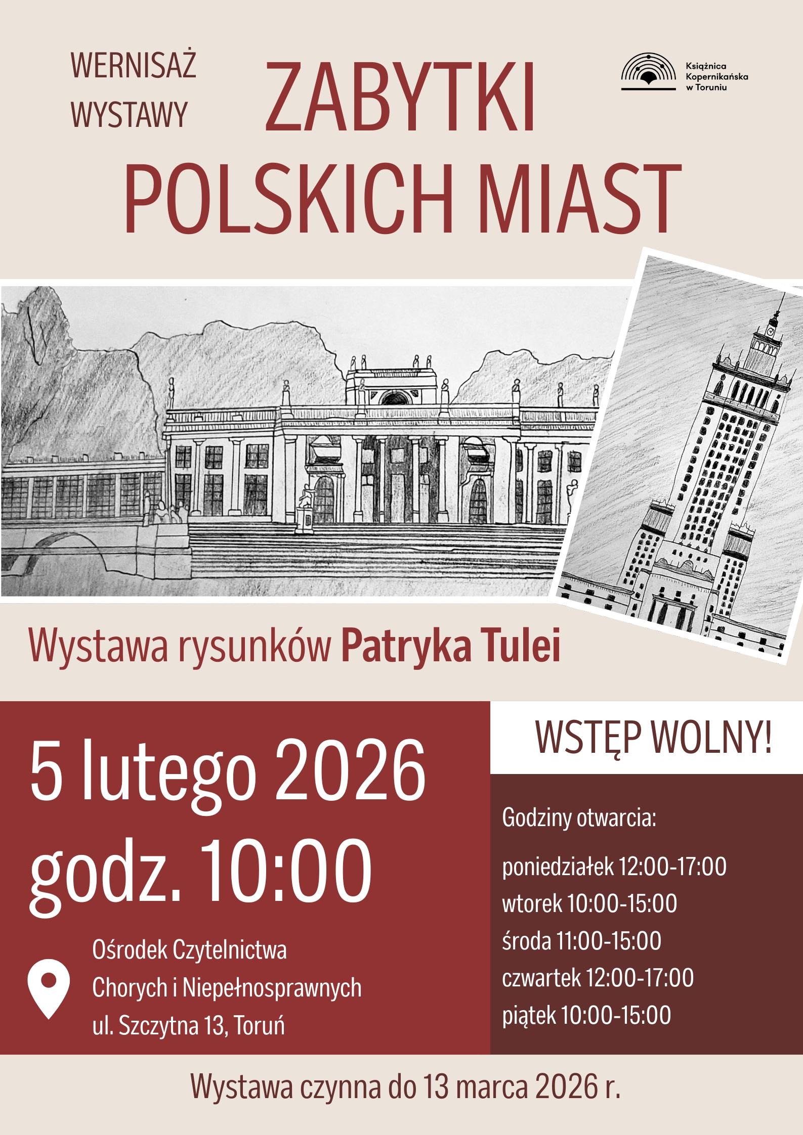 W dniu 5 lutego 2026 r. w Toruniu odbył się wernisaż pt. ZABYTKI POLSKICH MIAST. W ramach tego wydarzenia wystawione były kolejne prace ucznia naszej szkoły – Patryka Tulei. Zainteresowani mieli możliwość w Ośrodku Czytelnictwa Chorych i Niepełnosprawnych podziwiać szkice zabytków polskich miast.