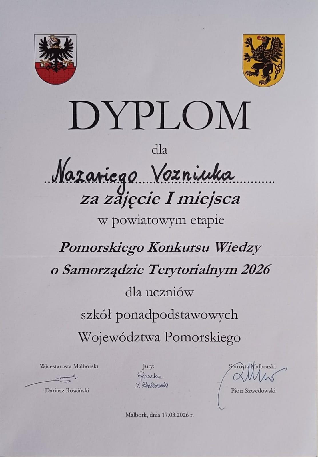 Z radością informujemy o sukcesie naszego ucznia, Nazariego Vozniuka z klasy IV LOm, który odniósł zwycięstwo w etapie powiatowym Pomorskiego Konkursu Wiedzy o Samorządzie Terytorialnym.