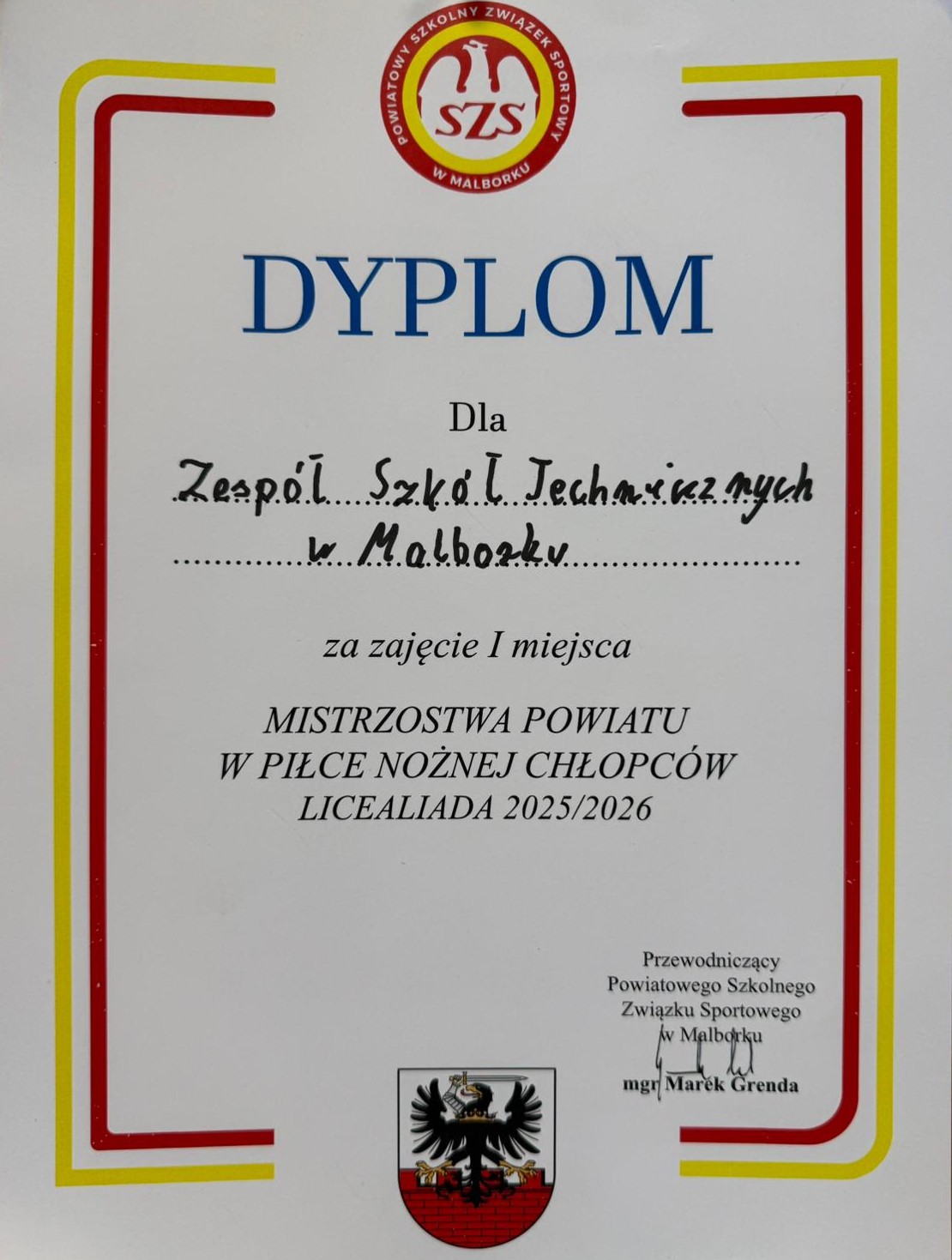 Reprezentacja Zespołu Szkół Technicznych w Malborku zajęła pierwsze miejsce w Mistrzostwach Powiatu w piłce nożnej chłopców rozgrywanych w ramach Licealiady.