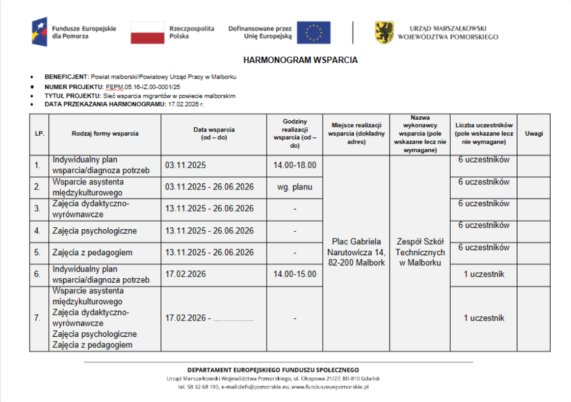Powiat Malborski/ Powiatowy Urząd Pracy w Malborku we współpracy z Miastem Malbork, Gminą Nowy Staw oraz Gminą Stare Pole, rozpoczął realizację projektu „Sieć wsparcia migrantów w powiecie malborskim” współfinansowanego ze środków Europejskiego Funduszu Społecznego Plus (EFS+) w ramach programu Fundusze Europejskie dla Pomorza 2021–2027.
